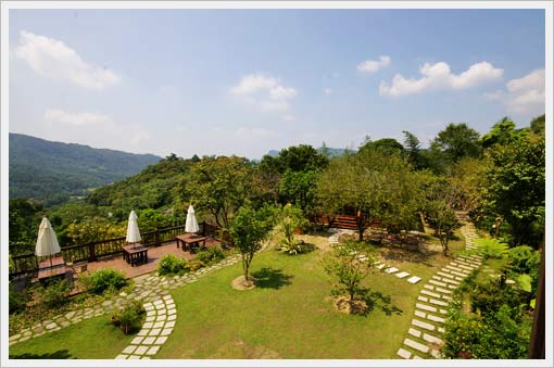 站在風山漸民宿二樓陽台,俯瞰園區中庭之一景。